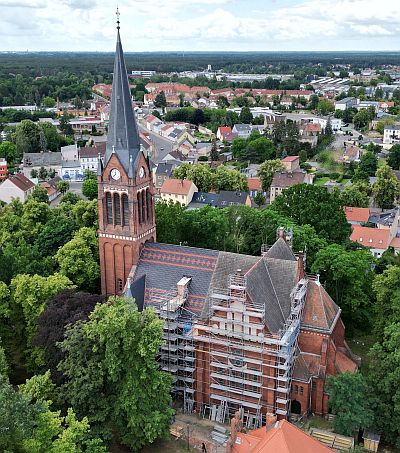 Erfreut können wir hier Luftbilder vom derzeitigen Stand (27. Juni 2023) der Dachdeckung der Jakobikirche zeigen, die uns das Planungsbüro Axel Seemann zur Verfügung gestellt hat.
