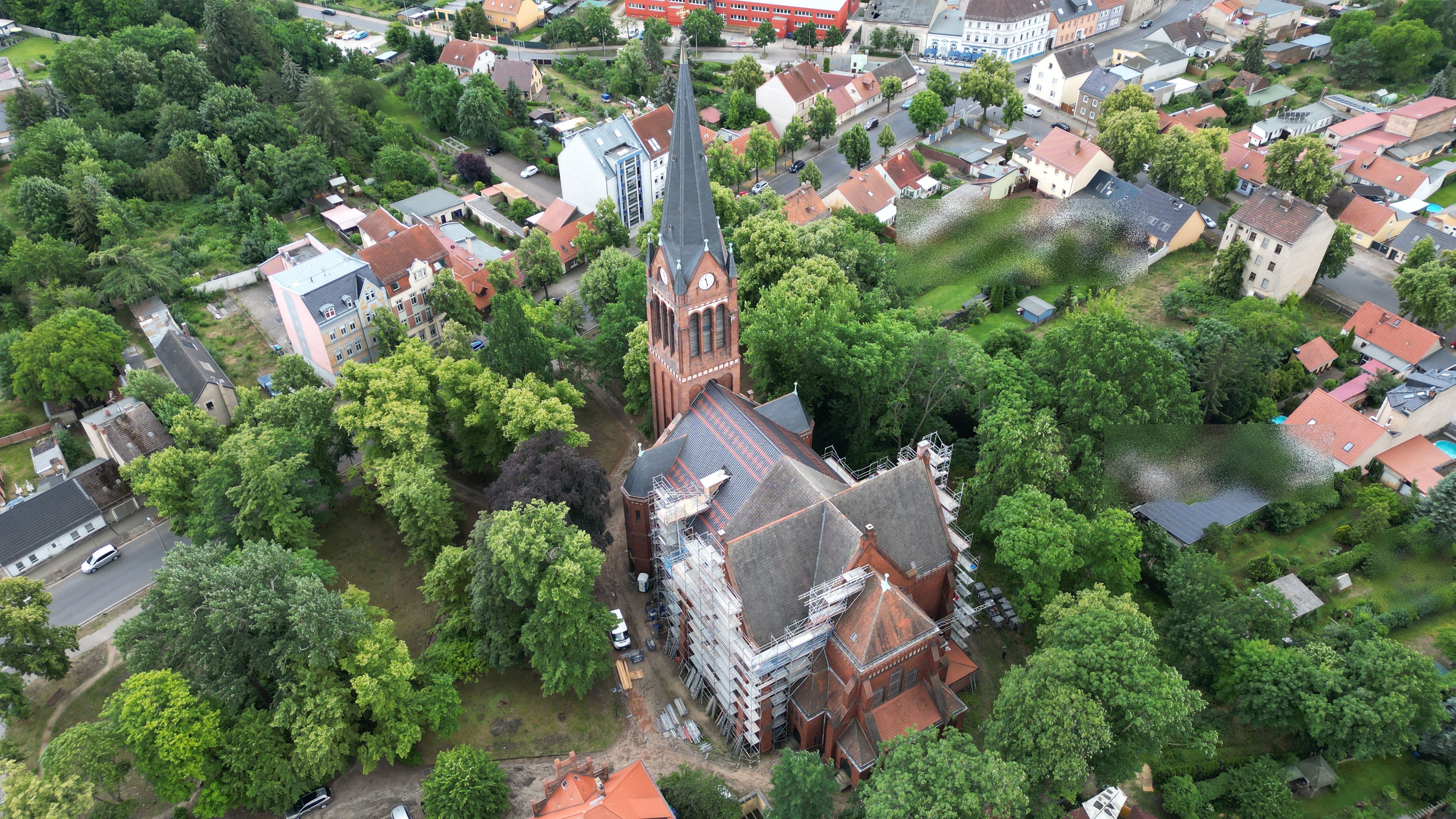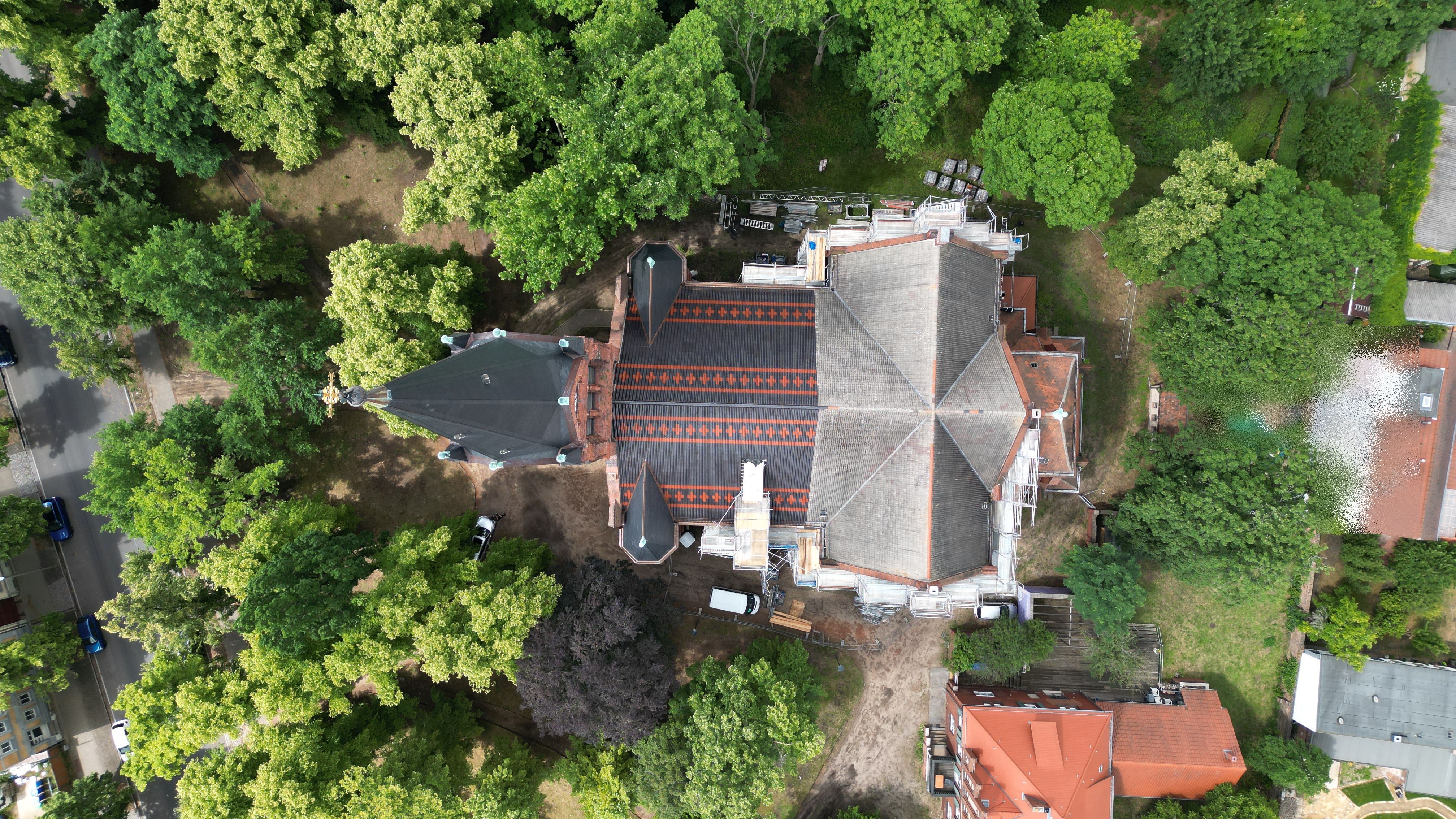 Erfreut können wir hier Luftbilder vom derzeitigen Stand (27. Juni 2023) der Dachdeckung der Jakobikirche zeigen, die uns das Planungsbüro Axel Seemann zur Verfügung gestellt hat.