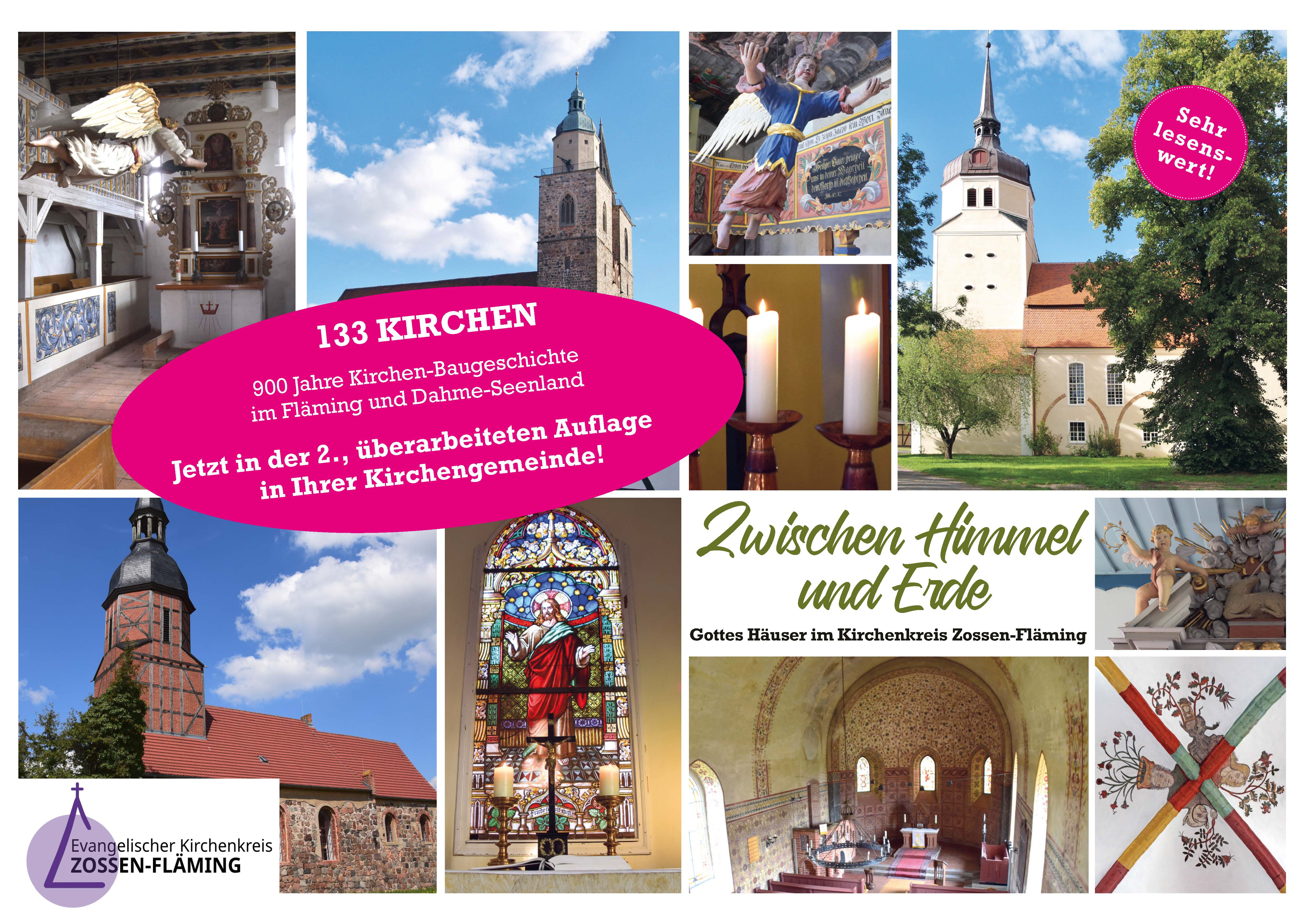 Mit dem Titel "Zwischen Himmel und Erde - Gottes Häuser im Kirchenkreis Zossen-Fläming" hat unser Kirchenkreis einen neuen Führer durch 900 Jahre Baugeschichte von 133 Kirchen in unserem Kirchenkreis herausgebracht.