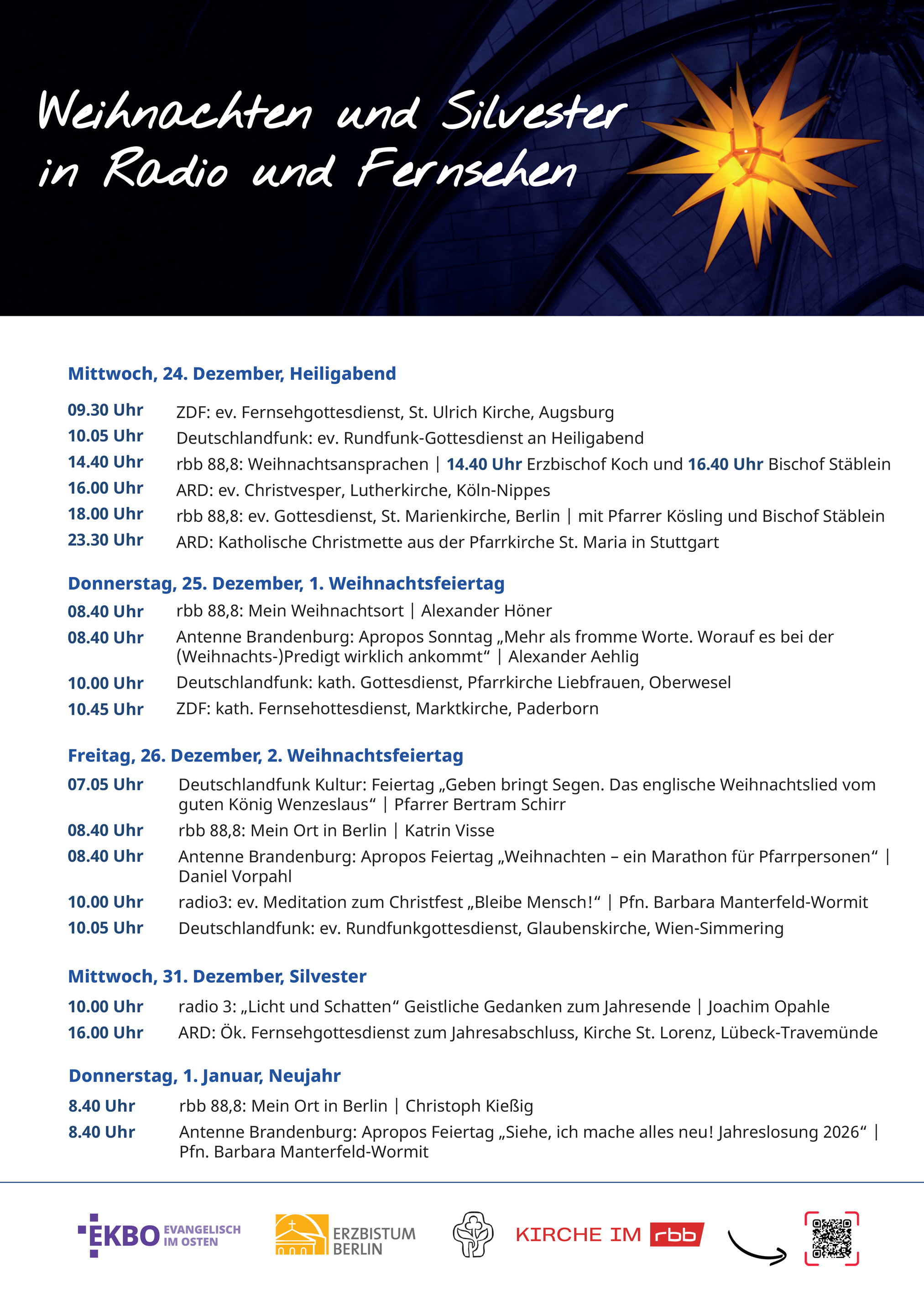 Auch der Rundfunk informiert unter kirche-im-rbb.de über sein breites Programm an Gottesdiensten, Andachten und Sendungen, die sich um Weihnachten und Chanukka drehen.